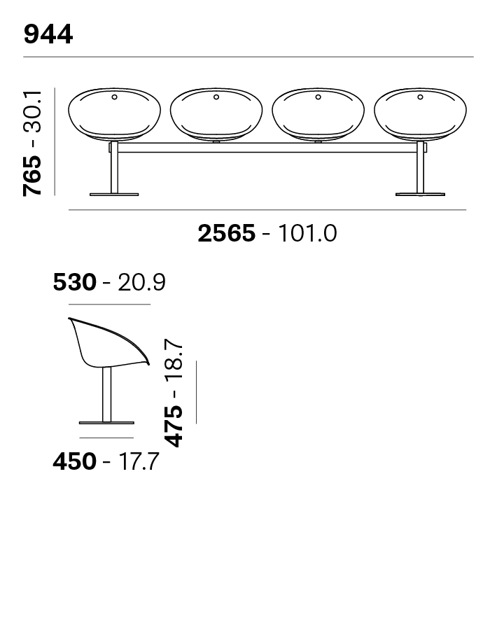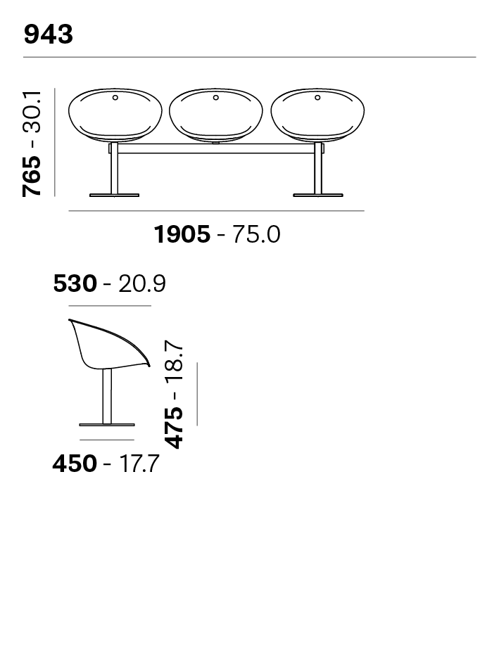Gliss are o formă confortabilă și ergonomică inspirată de scaunele iconice din anii '50, cu o gaură distinctivă în carcasă. Colecția se remarcă prin confortul și funcționalitatea sa, date de cotierele sinuoase care îmbrățișează corpul și de ușurința de manevrare. Bancă cu trei sau patru locuri, cu carcasă din tehnopolimer și cadru din oțel inoxidabil, sau cu trei locuri cu blat laminat.