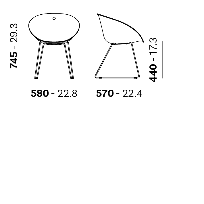 Gliss are o formă confortabilă și ergonomică, inspirată de scaunele iconice „anii '50”, cu o gaură distinctivă în carcasă. Colecția se remarcă prin confortul și funcționalitatea sa, date de cotierele sinuoase care îmbrățișează corpul și de ușurința în manevrare. Fotoliu cu carcasă din tehnopolimer și cadru din sanie din tijă de oțel Ø 10 mm.