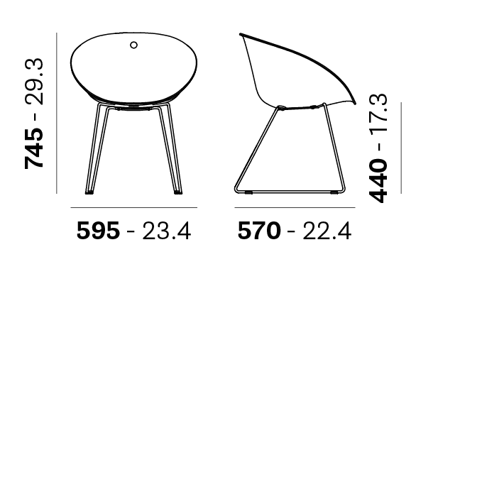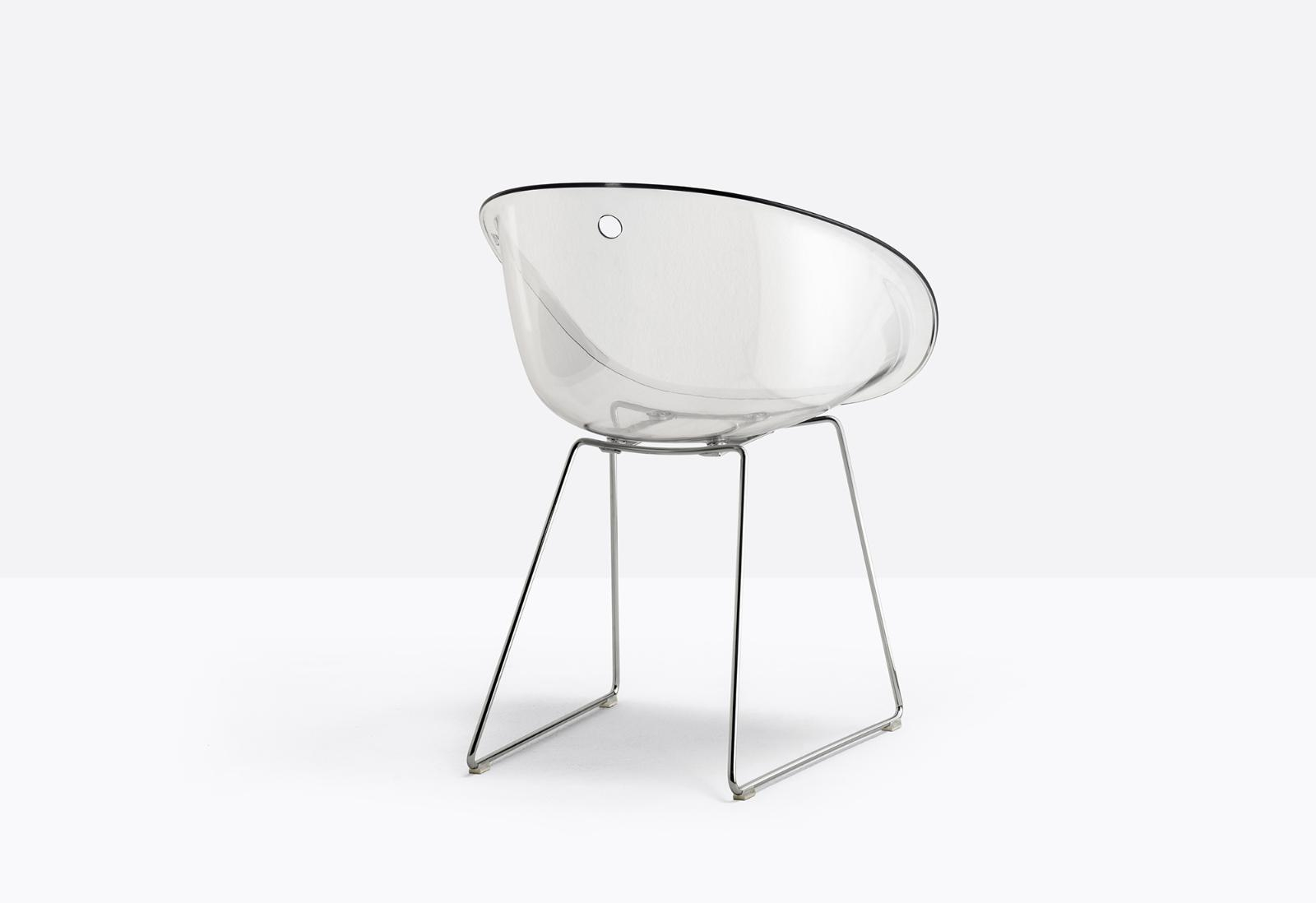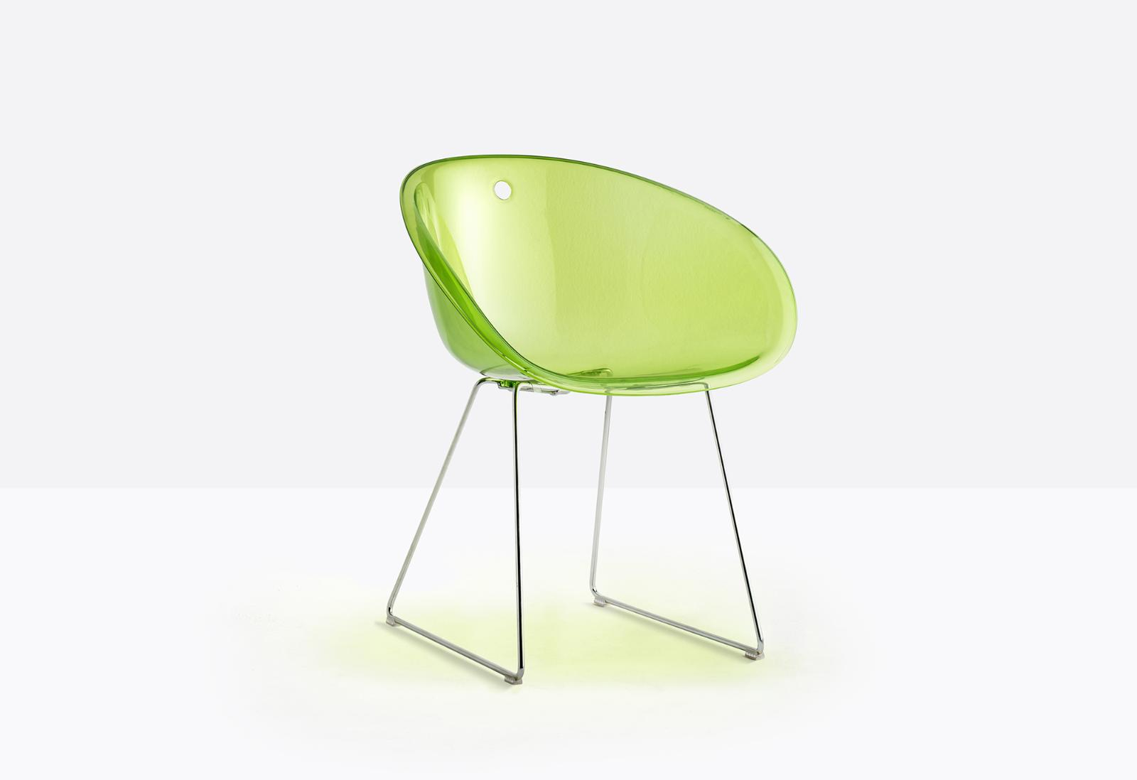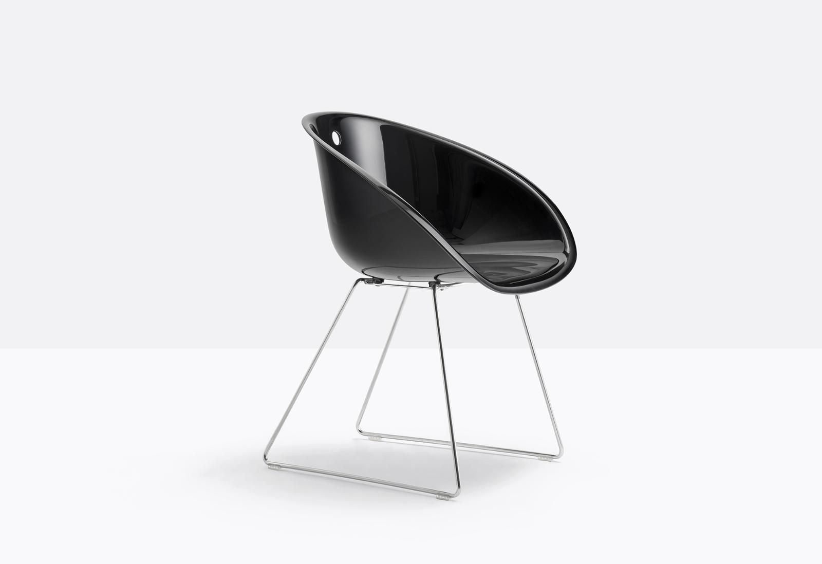 Gliss are o formă confortabilă și ergonomică, inspirată de scaunele iconice „anii '50”, cu o gaură distinctivă în carcasă. Colecția se remarcă prin confortul și funcționalitatea sa, date de cotierele sinuoase care îmbrățișează corpul și de ușurința în manevrare. Fotoliu cu carcasă din policarbonat și cadru din tijă de oțel cu Ø 10 mm.