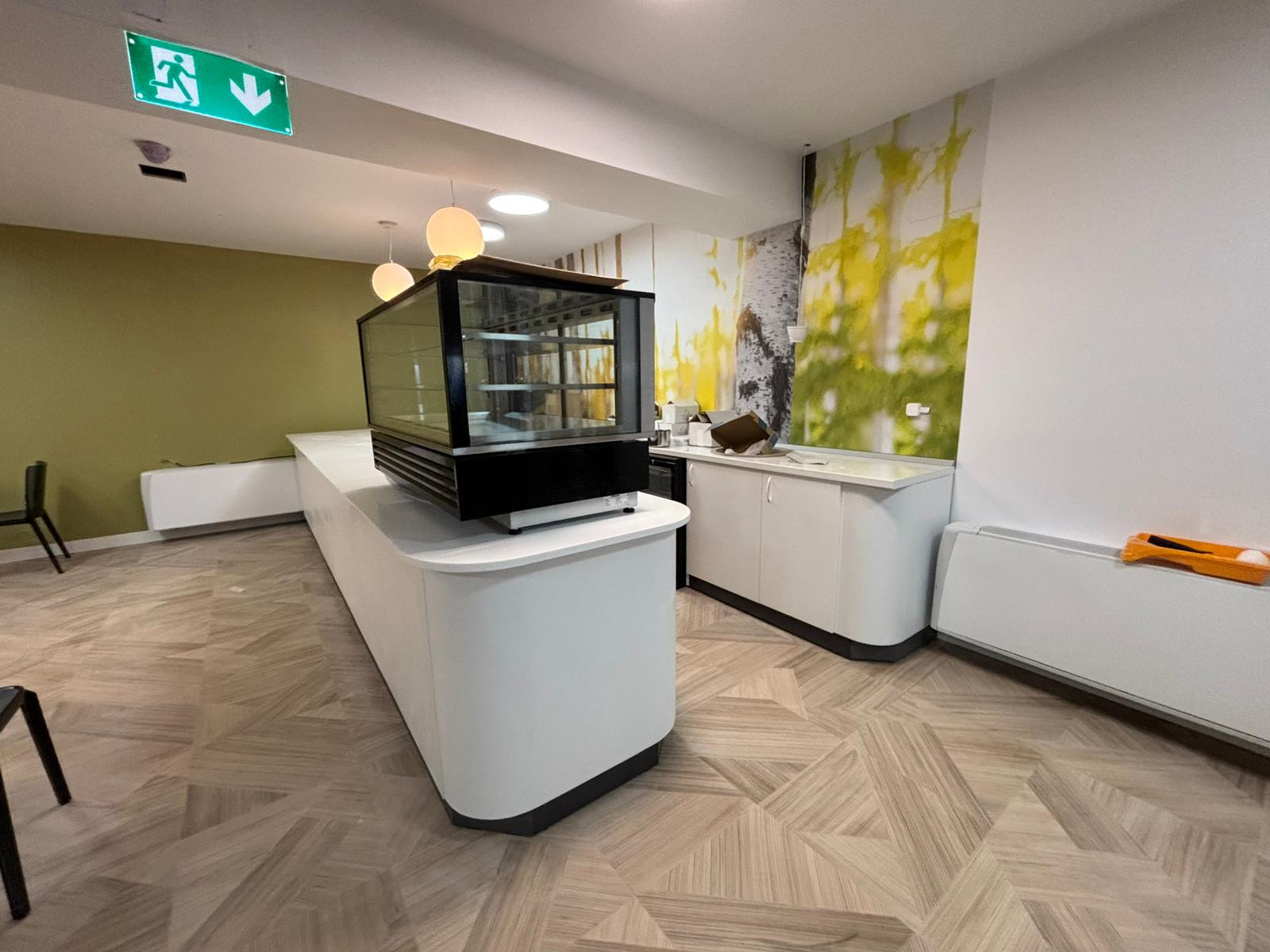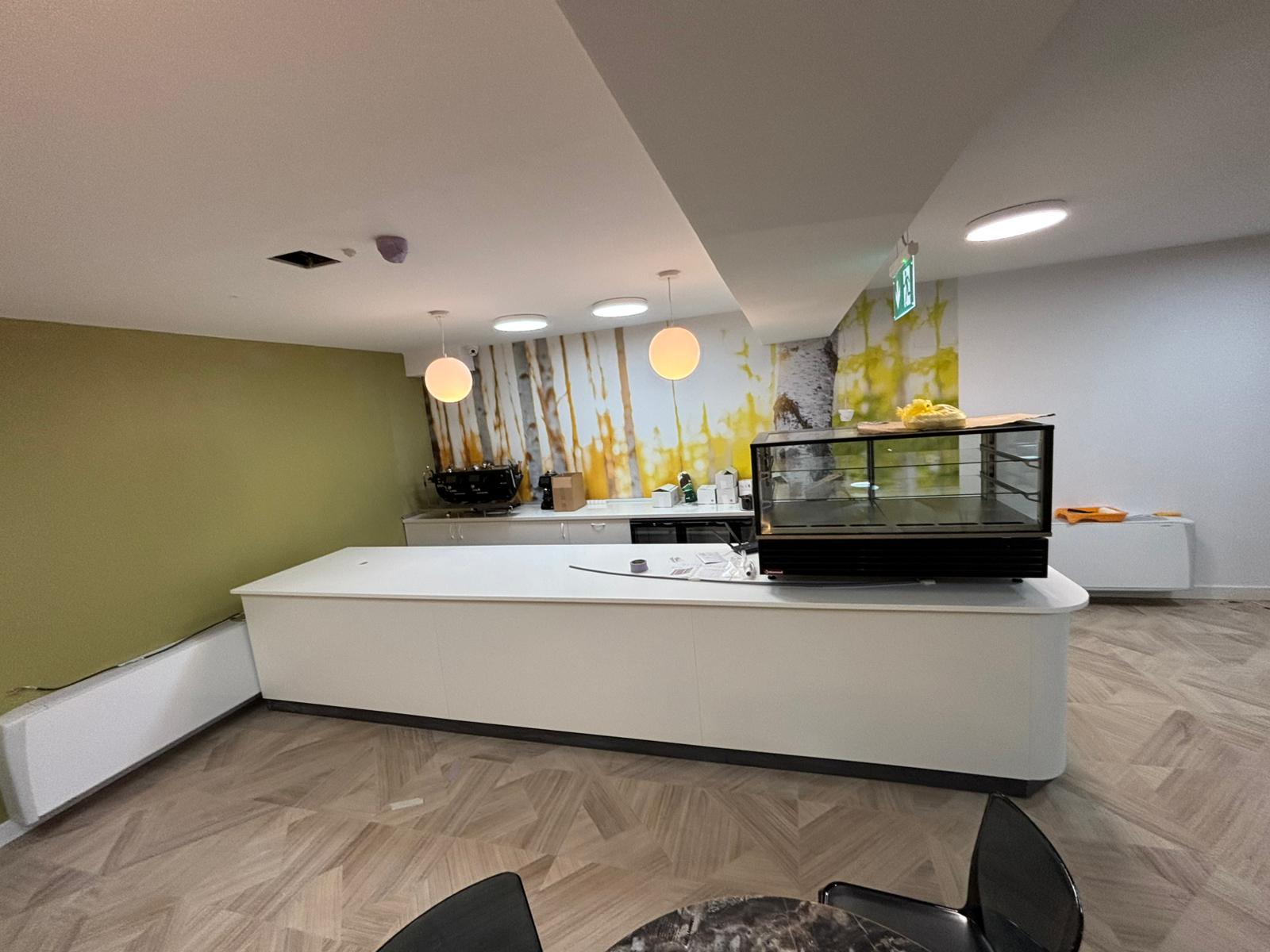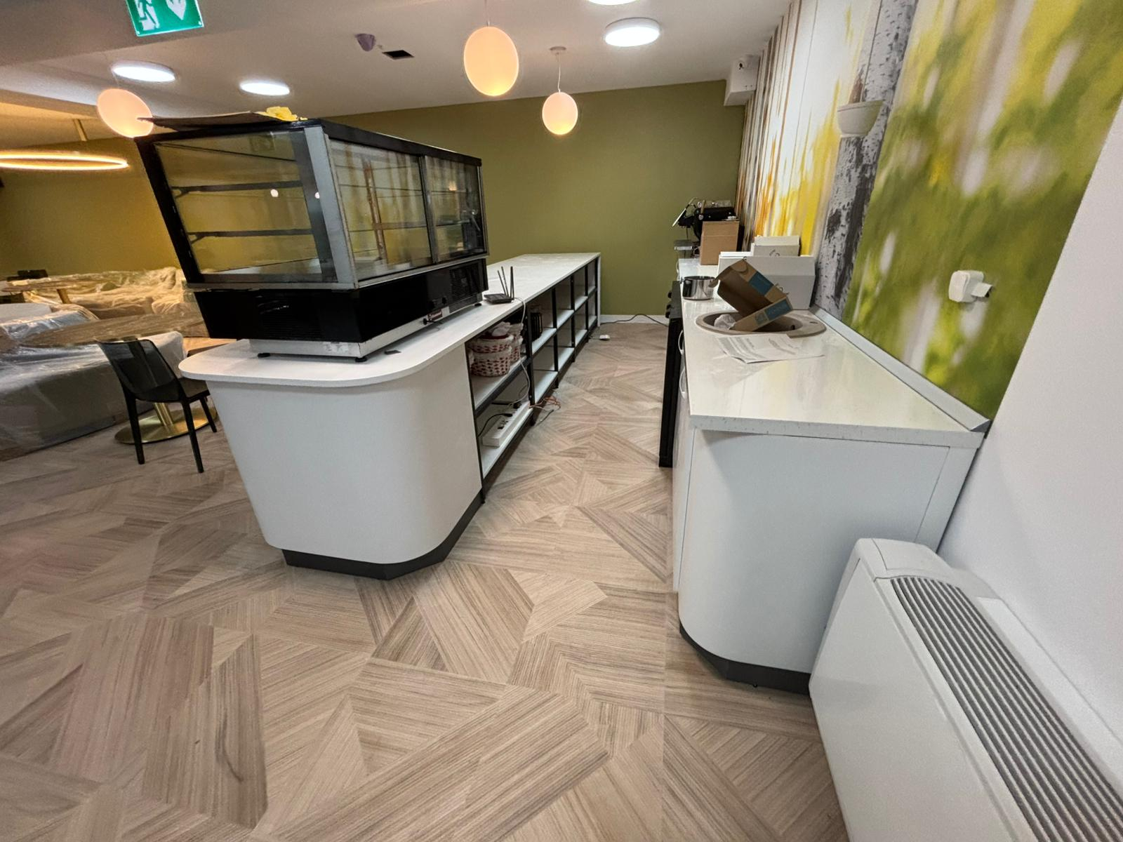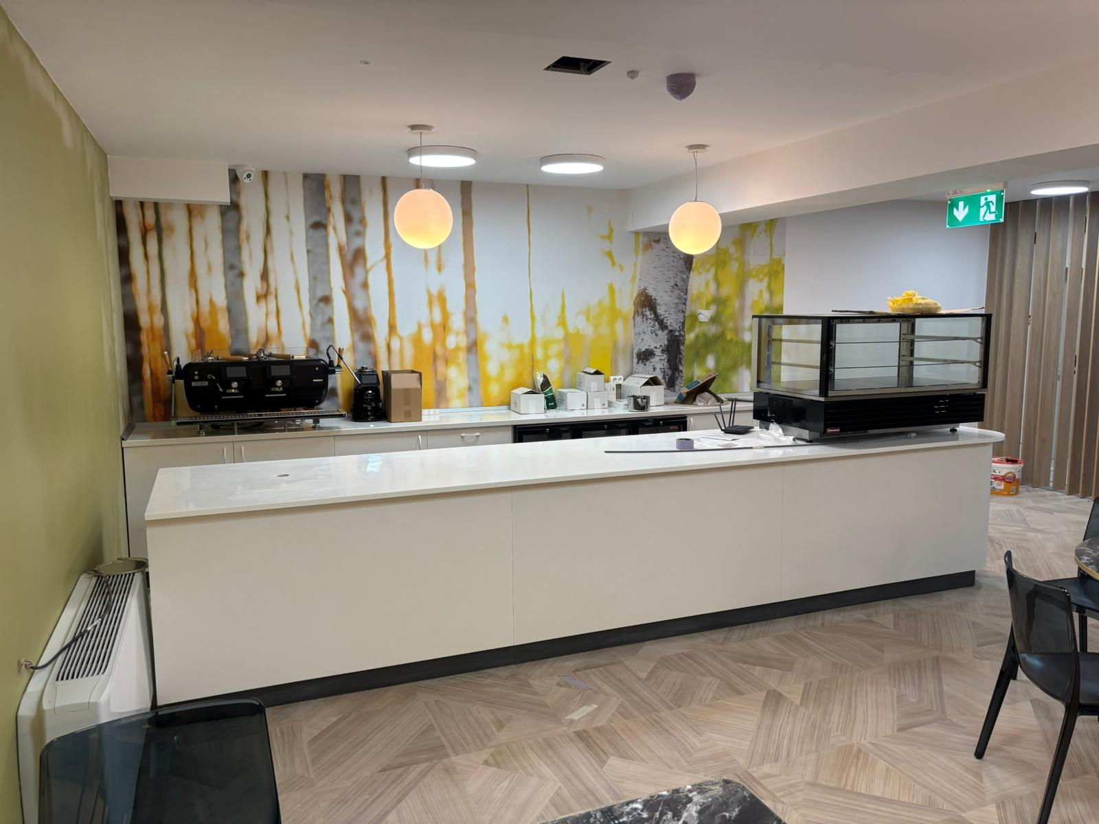 Bar cafenea realizat din PAL melaminat cu blat din compozit (Corian, HI-Macs) cu front-uri din HPL.