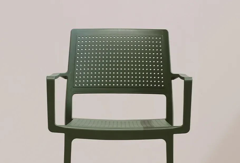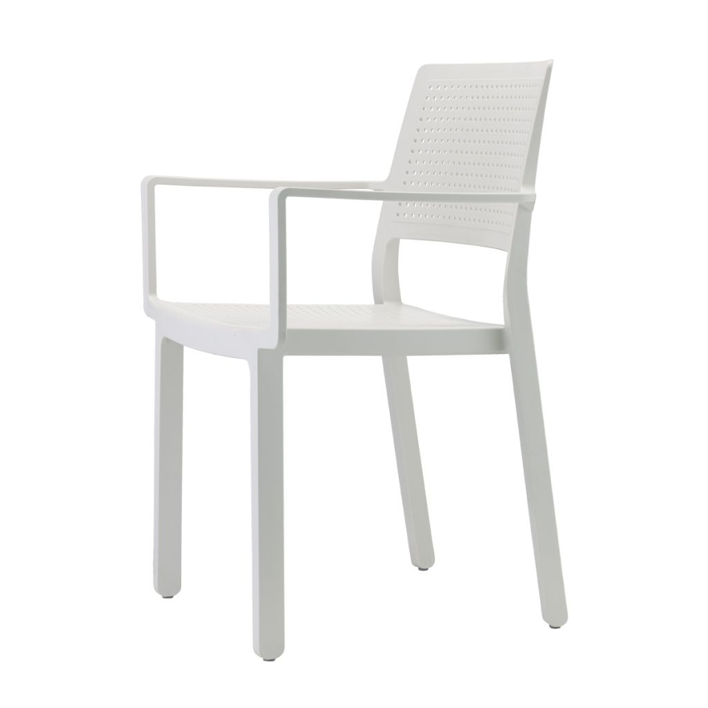 Scaun cu brate pentru terasa sau restaurant Emi, cu un aspect discret, linii curate și confort, cadrul este realizat în întregime din tehnopolimer, în timp ce perforațiile fac ca Emi să fie ideală pentru spațiile exterioare, atât acasă, cât și pentru uz contract.